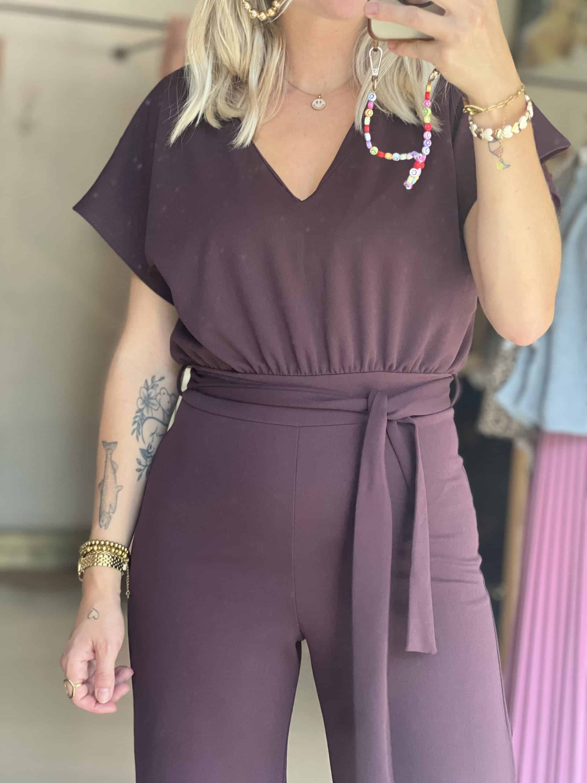 Deze jumpsuit van sisterspoint valt goed op maat. De lengtemaat is 32 en zit hetzelfde als de bekende glut pants van sisters point. Deze bordeaux jumpsuit heeft een V hals en een knoopje achter in de nek.