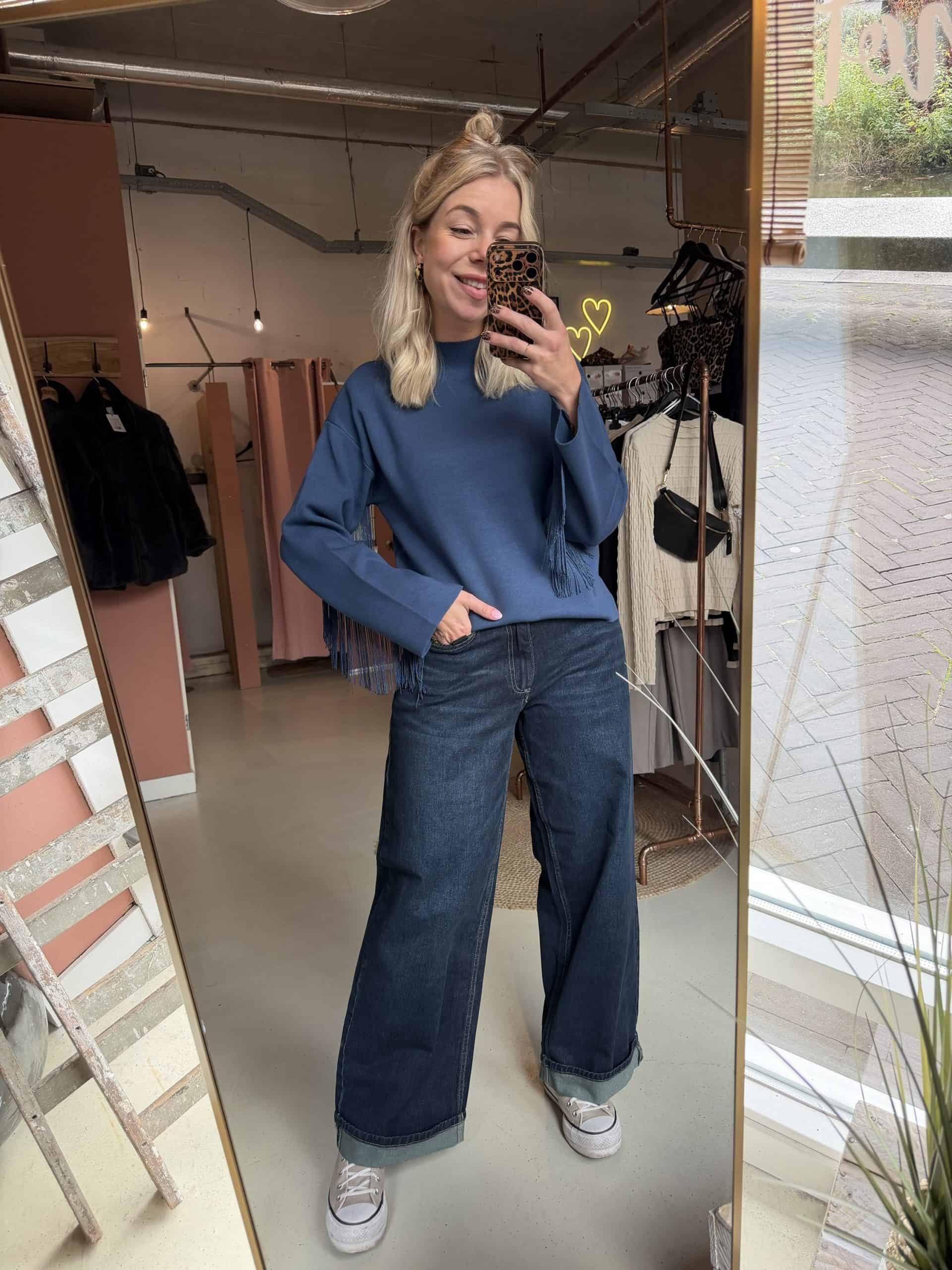 Een toffe trui met turtleneck en fringe. Ook nog in een mooie blauwe kleur die goed gaat op bruin, spijker en beige.