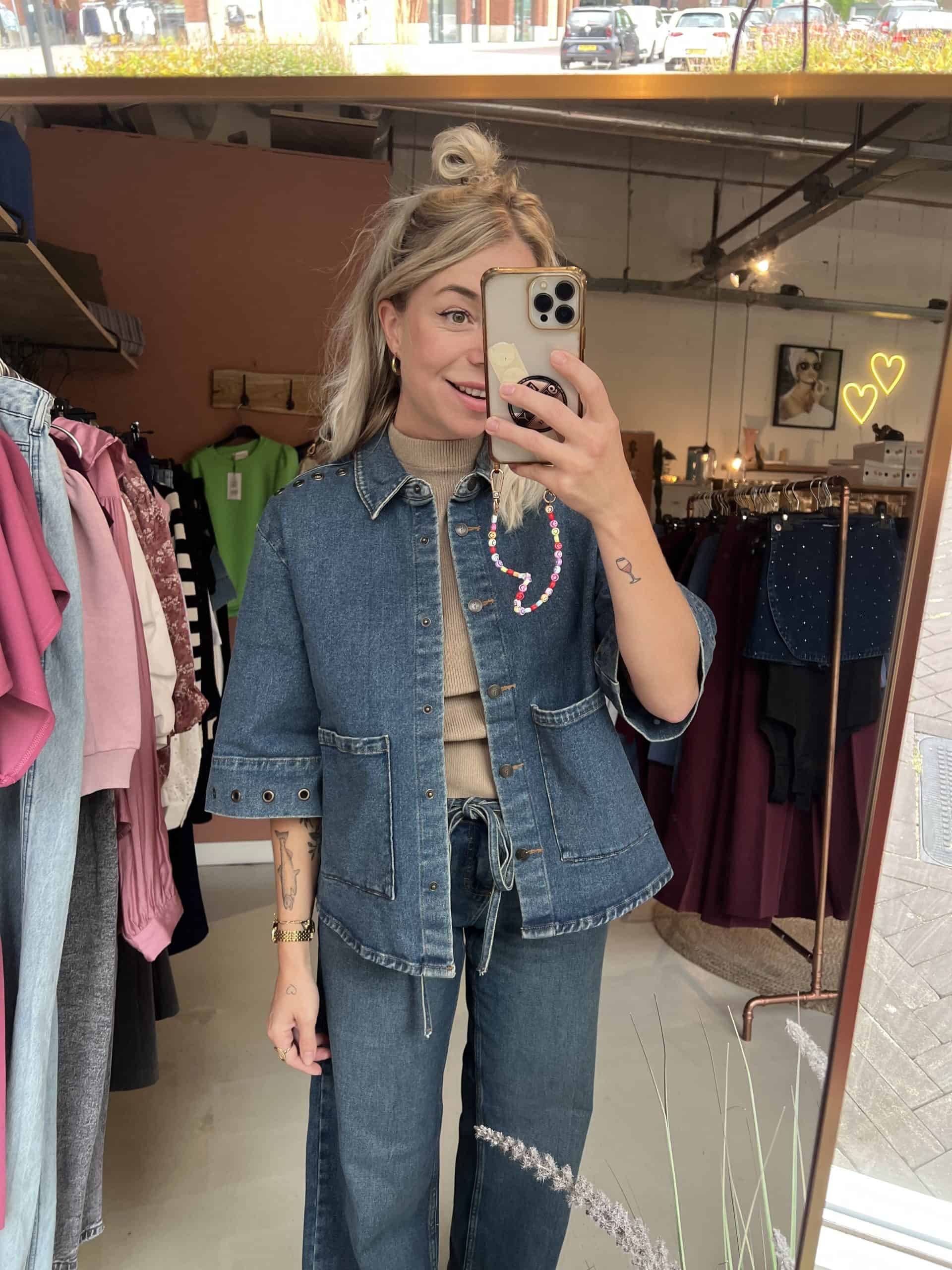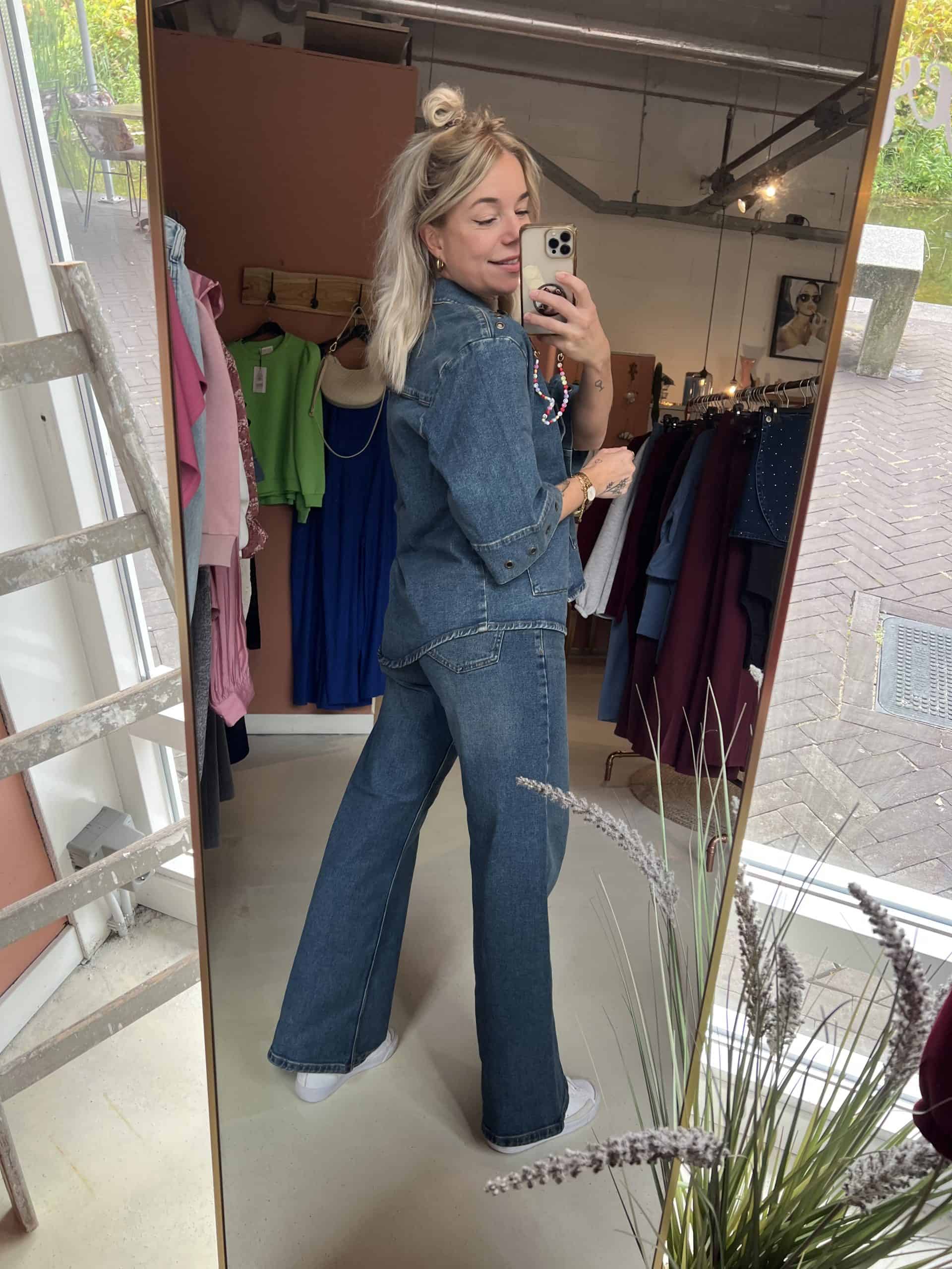 en hij valt niet heel wijd. Een mooi model en een bijpassende blouse met drukknoopjes