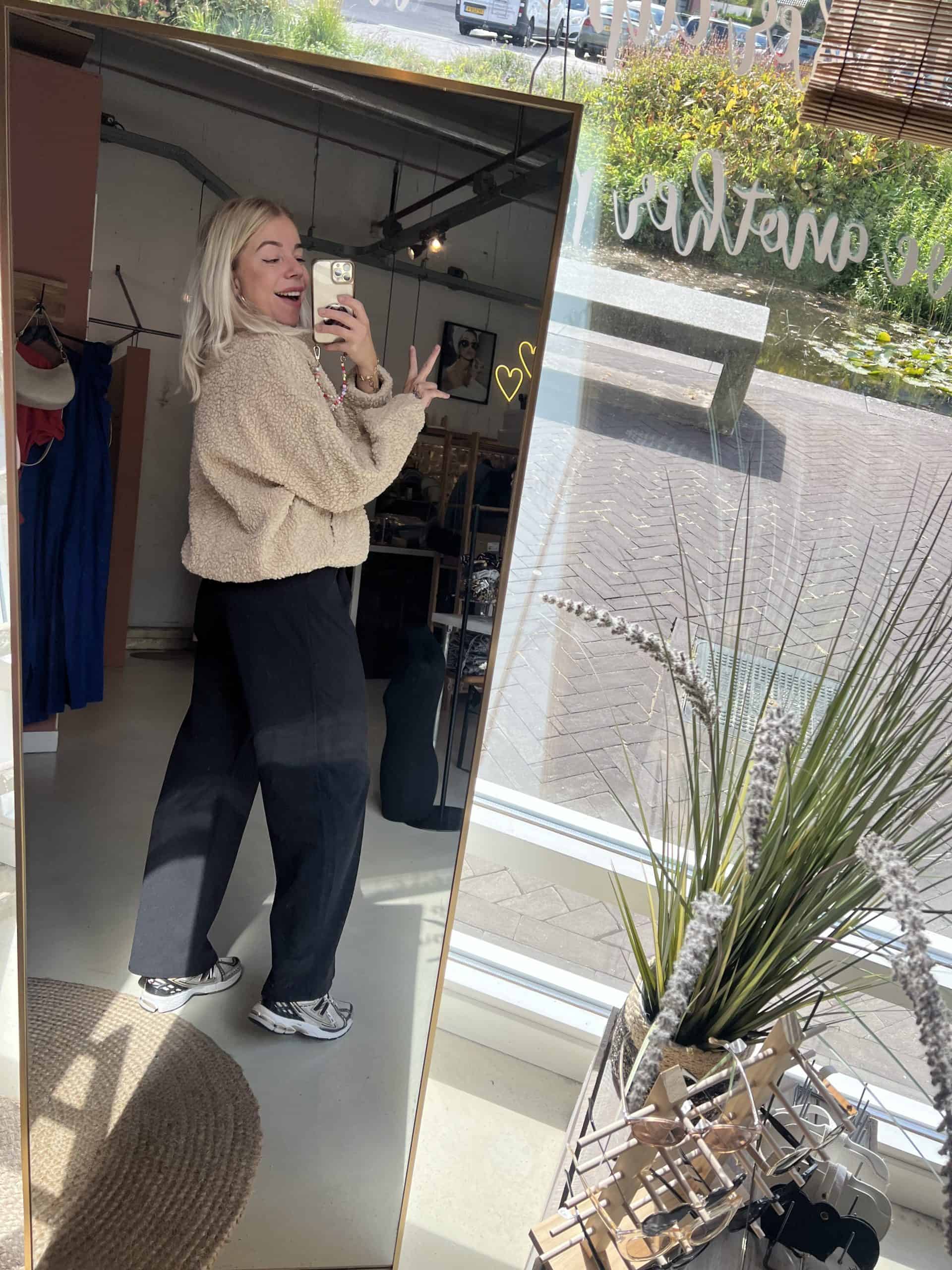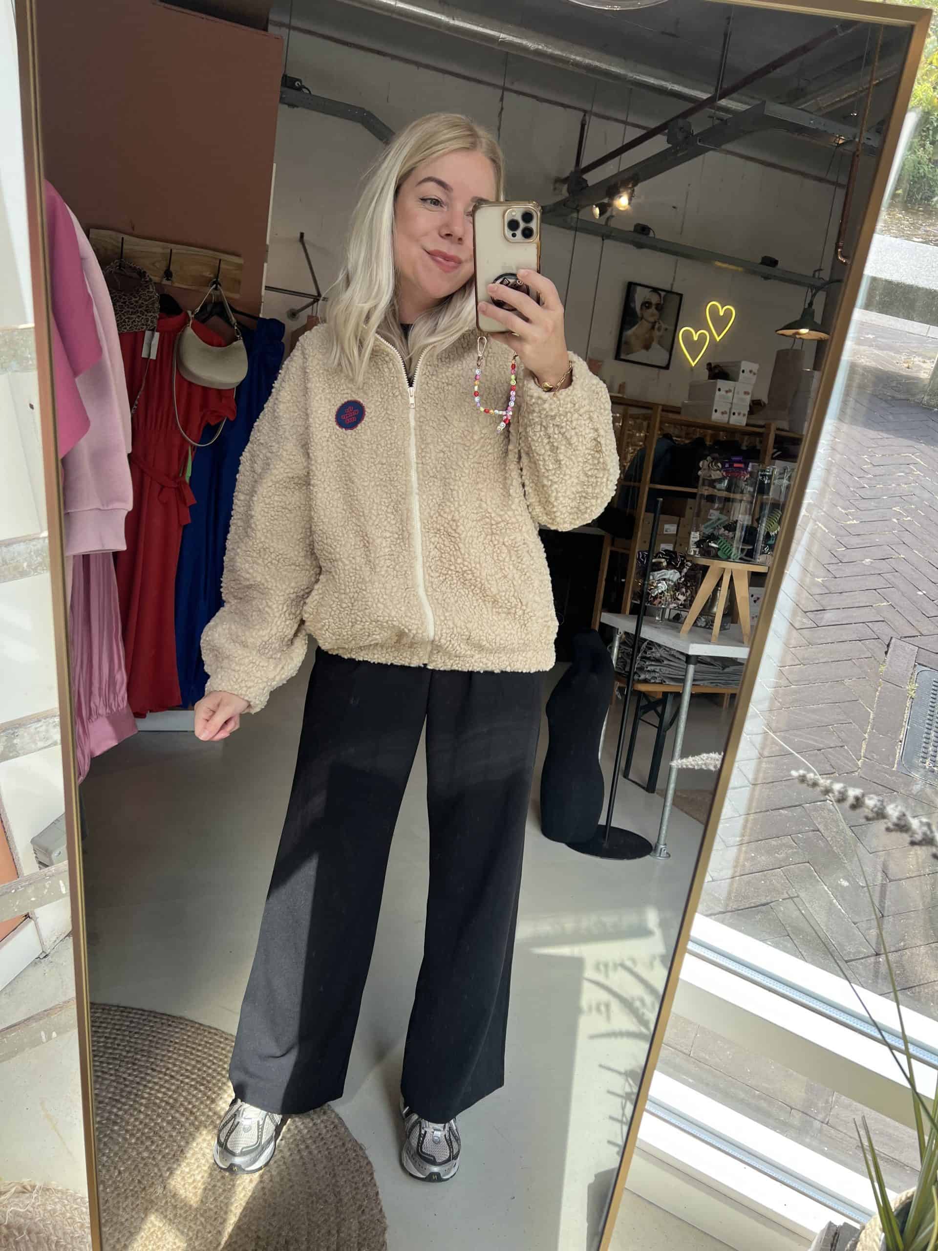 Ik sla hem om omdat ik een korter bovenlijf heb. Verkrijgbaar in drie kleuren. mouwen zijn lang genoeg om tot en met L te dragen