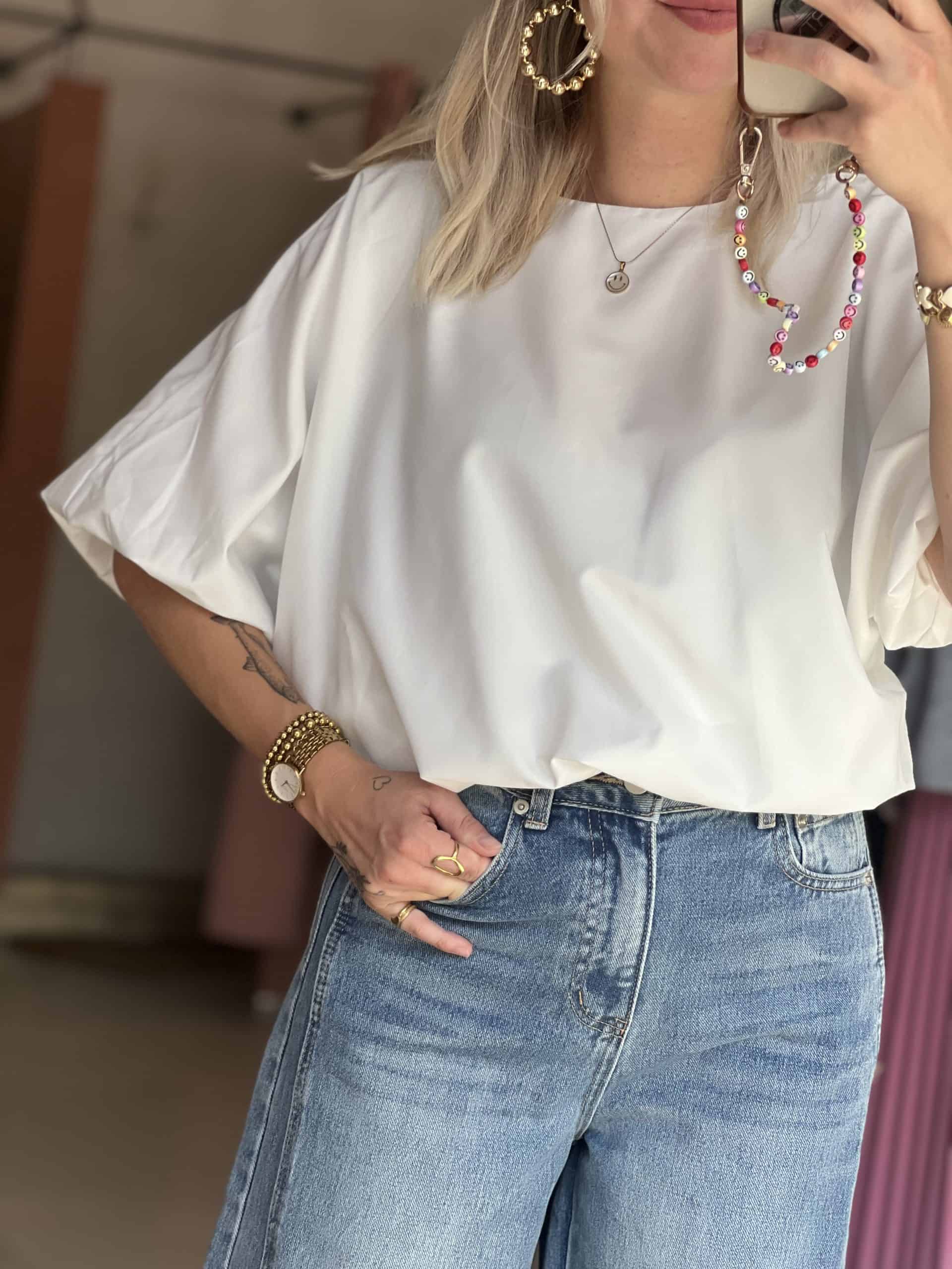 Deze leuke top heeft elastiek om de mouwen en om het middel. Echt perfect op een hoge broek of rok. Ook te leuk op deze barrel broek omdat je daar taille op moet creëren. Hij valt ruim, dus adviseren wij een maat kleiner